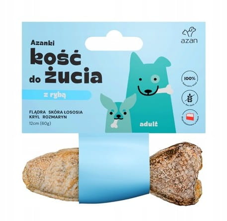Kość do żucia dla psa AZANKI RYBKA to naturalny gryzak dla dorosłych psów wszystkich ras, łączący skórę wołową ze skórą łososia i nadzieniem z flądry. Wyróżnia się rybną recepturą z dodatkiem kryla, małży i rozmarynu, które urozmaicają smak i aromat. kość 12 cm.