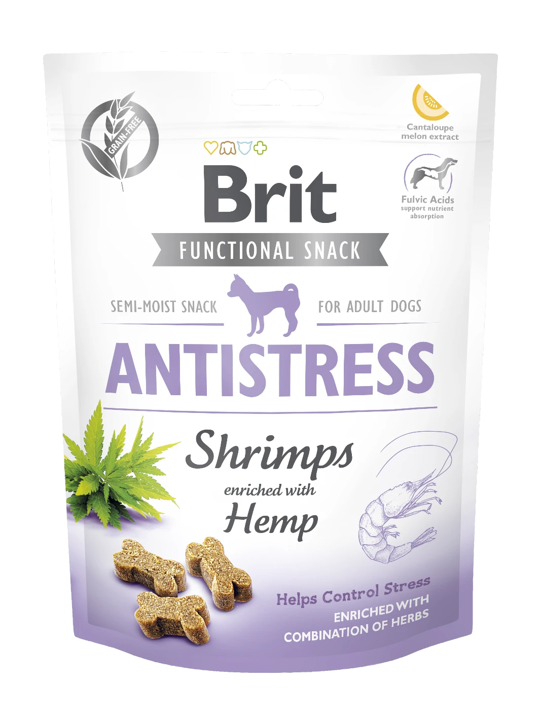 Brit Care Dog Functional Snack Antistress to funkcjonalne, półmiękkie przysmaki dla psów o smaku krewetek i konopi. Produkt jest karmą uzupełniającą – przeznaczoną do podawania jako przekąska między posiłkami lub nagroda podczas treningu, a także w sytuacjach, które mogą wywoływać u psa niepokój. Receptura została przygotowana na bazie dehydratyzowanych krewetek, dyni i czerwonej soczewicy, z dodatkiem kolagenu, oleju z łososia oraz składników roślinnych: suszonych konopi, suszonego korzenia kozłka lekarskiego i suszonego głogu. W składzie znajduje się również inaktywowane Lactobacillus acidophilus HA–122 oraz dodatek żywieniowy w postaci witaminy C. Przysmaki zawierają konserwanty zatwierdzone przez UE: kwas cytrynowy (E 330) oraz kwas DL–jabłkowy (E 296).