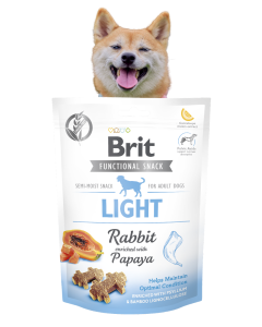Brit Care Dog Functional Snack Light to funkcjonalne, półmiękkie przysmaki dla psów, stworzone jako karma uzupełniająca do codziennej diety. Receptura została oparta na dehydratyzowanym króliku, dyni oraz czerwonej soczewicy, a skład uzupełniają m.in. lignoceluloza bambusowa, nasiona i łuski psylium, suszona papaja oraz olej z łososia. Produkt zawiera także kwas fulwowy, minerały, ekstrakt z melona Kantalupa oraz inaktywowane Lactobacillus acidophilus HA–122. W dodatkach żywieniowych podano L-karnitynę, a receptura zawiera konserwanty zatwierdzone przez UE: kwas cytrynowy (E 330) oraz kwas DL–jabłkowy (E 296).