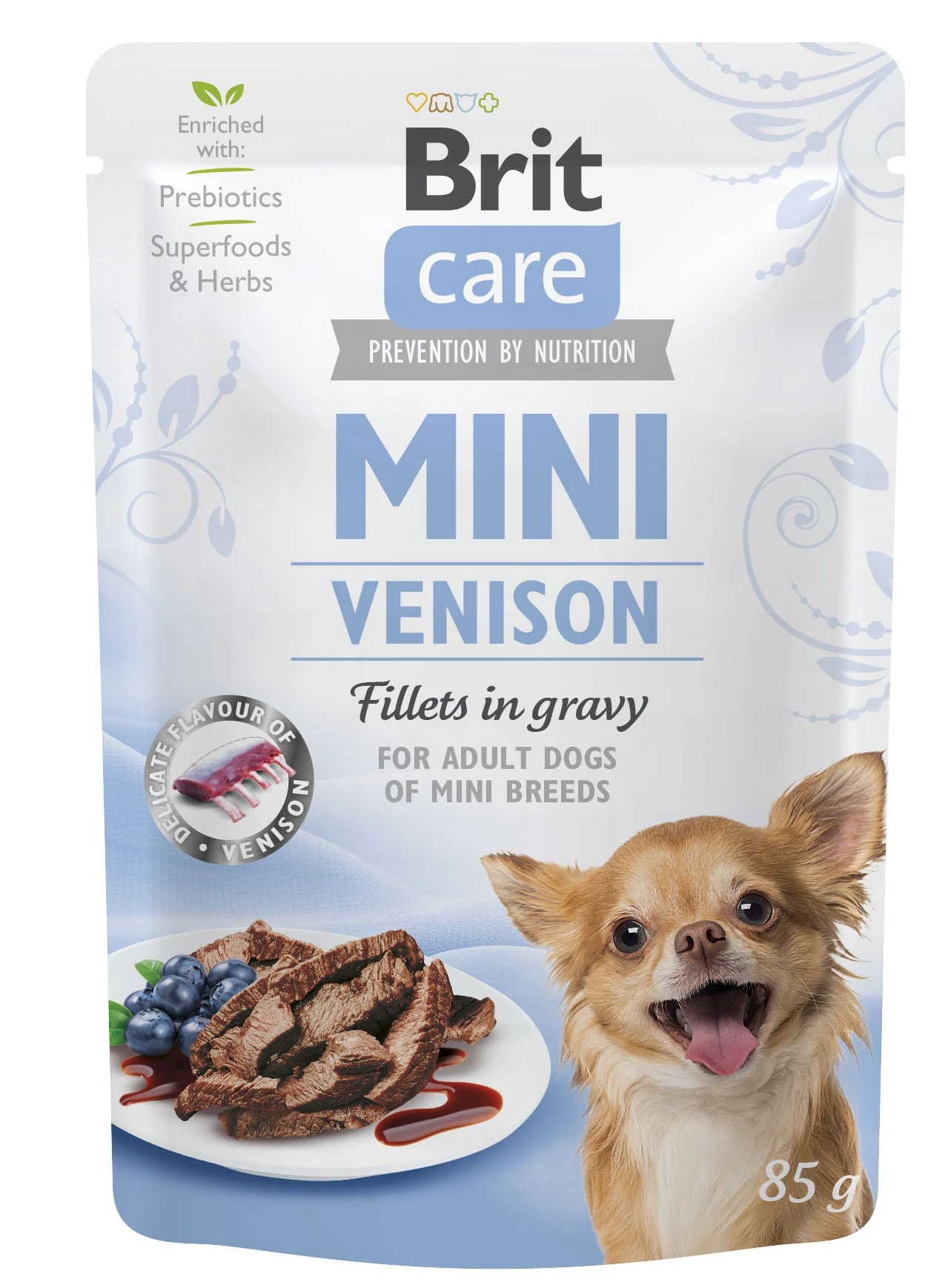 Brit Care Mini Pouch to pełnoporcjowa karma mokra dla psów ras małych i miniaturowych w formie kawałków mięsnych filetów w delikatnym sosie własnym. Receptura opiera się na mięsie i produktach pochodzenia zwierzęcego, a smak uzupełnia dodatek ziół i owoców oraz olej z łososia. W składzie znajdują się także prebiotyki (mannanooligosacharydy, fruktooligosacharydy) oraz inulina. Karma jest przeznaczona do podawania w temperaturze pokojowej i może stanowić samodzielny posiłek lub urozmaicenie diety – w takim przypadku należy odpowiednio zmniejszyć dzienną dawkę dotychczasowej karmy. Po otwarciu saszetkę należy przechowywać w lodówce.