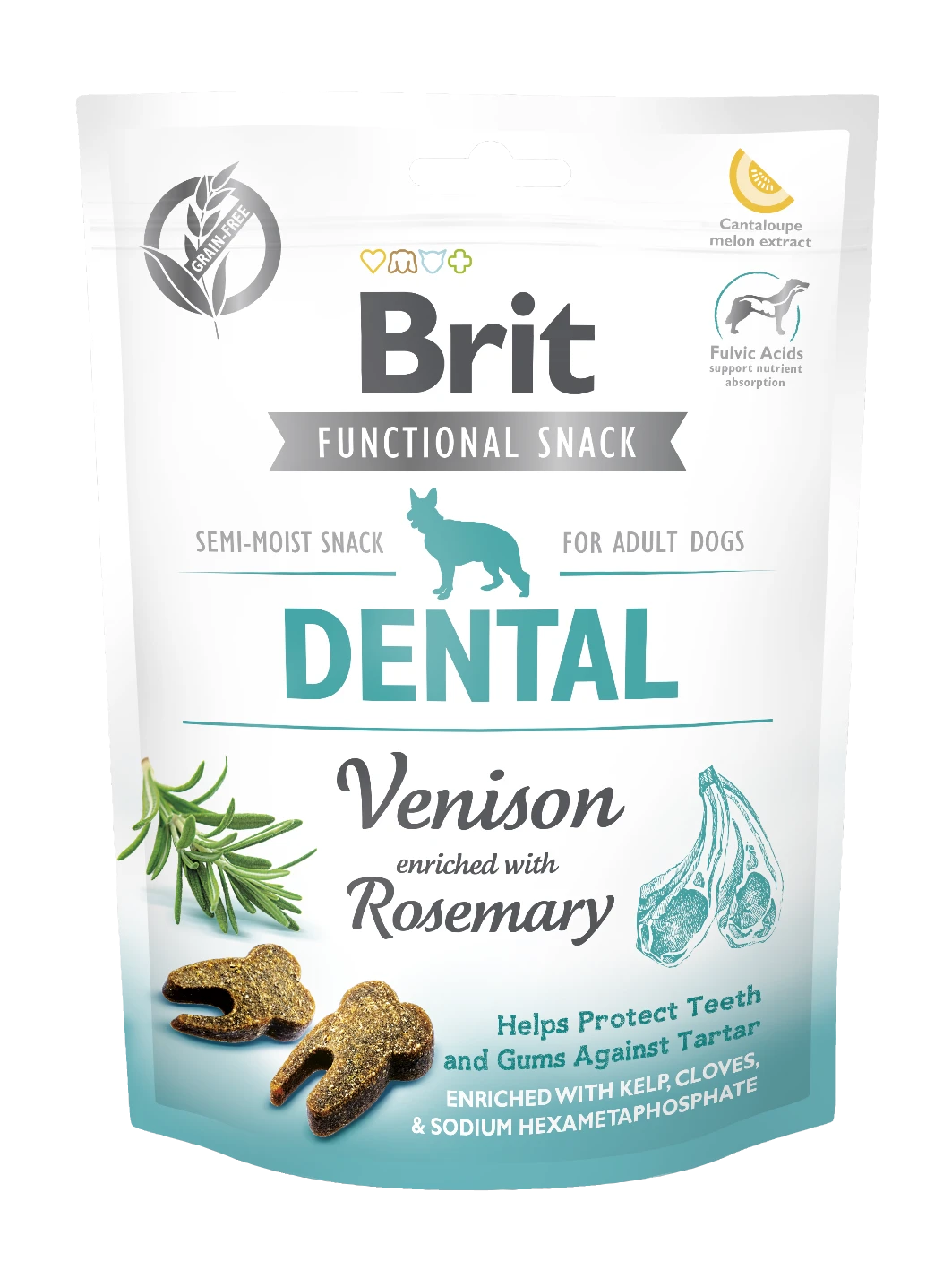 Brit Care Dog Functional Snack Dental to funkcjonalne, półmiękkie przysmaki dla psów na bazie jelenia z dodatkiem ziół. Produkt jest karmą uzupełniającą – przeznaczoną do podawania jako przekąska między posiłkami lub nagroda podczas treningu. Receptura została przygotowana z dehydratyzowanego jelenia, dyni, czerwonej soczewicy i skrobi roślinnej, z dodatkiem kolagenu oraz składników wspierających higienę jamy ustnej, takich jak suszone algi morskie Kelp i heksametafosforan sodu. W składzie znajdują się również zioła: rozmaryn, szałwia i goździki, a także olej z łososia, kwas fulwowy, minerały, ekstrakt z melona Kantalupa oraz inaktywowane Lactobacillus acidophilus HA–122. Przysmaki zawierają konserwanty zatwierdzone przez UE: kwas cytrynowy (E 330) oraz kwas DL–jabłkowy (E 296).