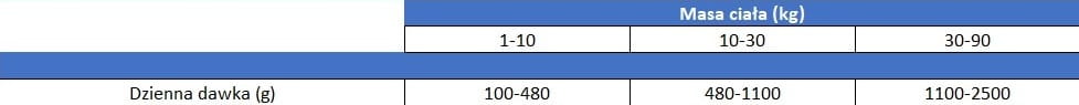 Wartości są orientacyjne – dobierz porcję do wieku, aktywności i warunków bytowych psa. Jeśli karma jest podawana jako urozmaicenie, odpowiednio pomniejsz porcję karmy podstawowej. Podawaj w temperaturze pokojowej i zapewnij stały dostęp do świeżej wody.