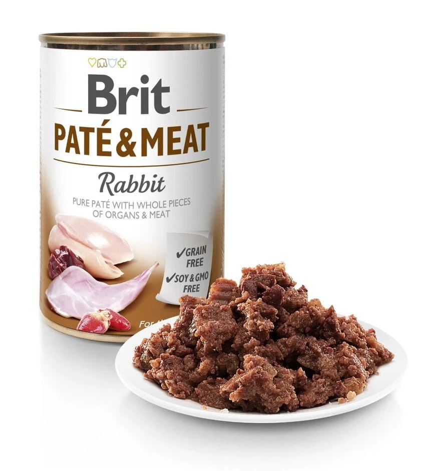 Mokra karma dla psa z królikiem BRIT Pate&Meat Rabbit to pełnoporcjowa, bezzbożowa receptura dla psów wszystkich ras, bez soi i GMO oraz bez sztucznych konserwantów i barwników. Zawiera łącznie 70% mięsa i narządów (kurczak i królik), a olej z łososia dostarcza kwasów omega-3 wspierających skórę i sierść. Puszka 400 g.