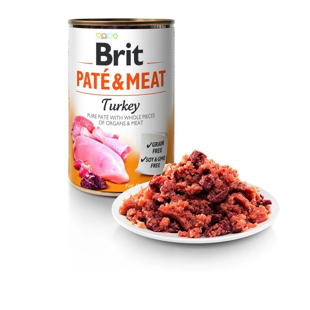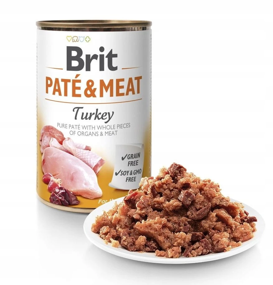 Mokra karma dla psa z indykiem BRIT Pate&Meat Turkey to pełnoporcjowa, bezzbożowa receptura dla psów wszystkich ras, bez soi i GMO oraz bez sztucznych konserwantów i barwników. Zawiera łącznie 70% mięsa i narządów (kurczak i indyk), a olej z łososia dostarcza kwasów omega-3 wspierających skórę i sierść. Puszka 400 g.