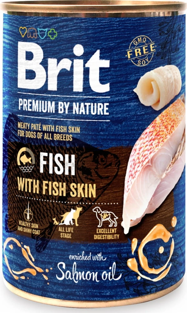 Karma mokra dla psa z rybą BRIT Premium By Nature Fish to pełnoporcjowy posiłek dla dorosłych psów wszystkich ras. Receptura łączy rybę i kurczaka z dodatkiem skóry ryb oraz oleju z łososia, zapewniając zbilansowane żywienie i wysoką smakowitość karmy.