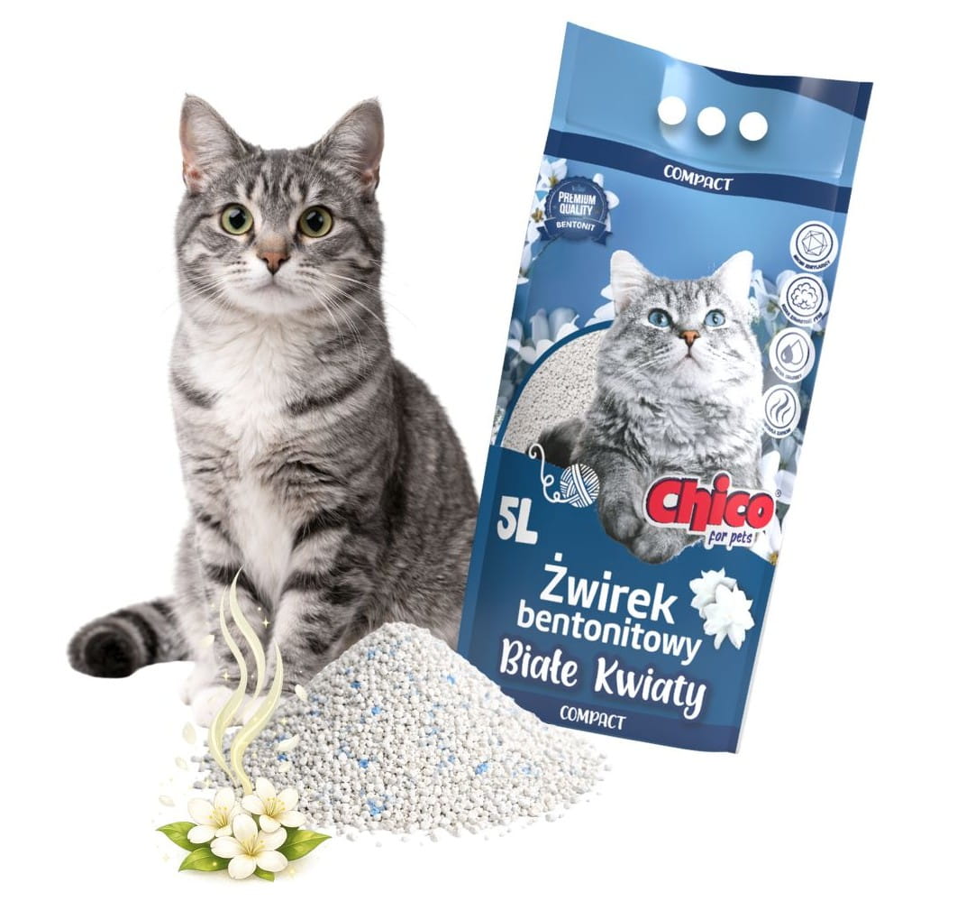 Żwirek bentonitowy dla kota CHICO Compact Białe Kwiaty to drobnoziarnisty, biały żwirek premium, który szybko zbryla się po kontakcie z wilgocią i ułatwia utrzymanie kuwety w czystości. Odpylony w 99,5% oraz z delikatnym aromatem białych kwiatów, skutecznie ogranicza nieprzyjemne zapachy i zwiększa komfort domowników. worek 5 l.