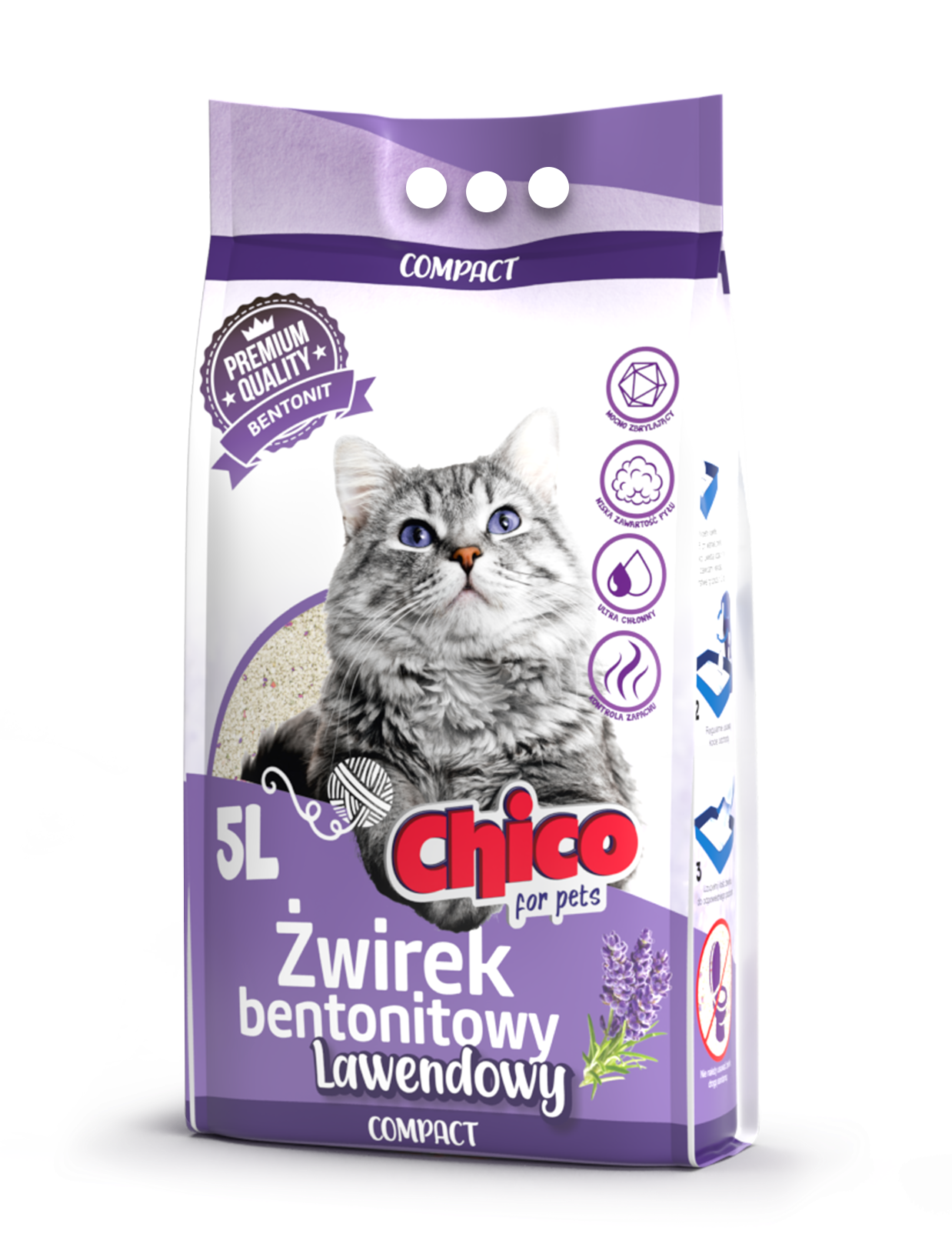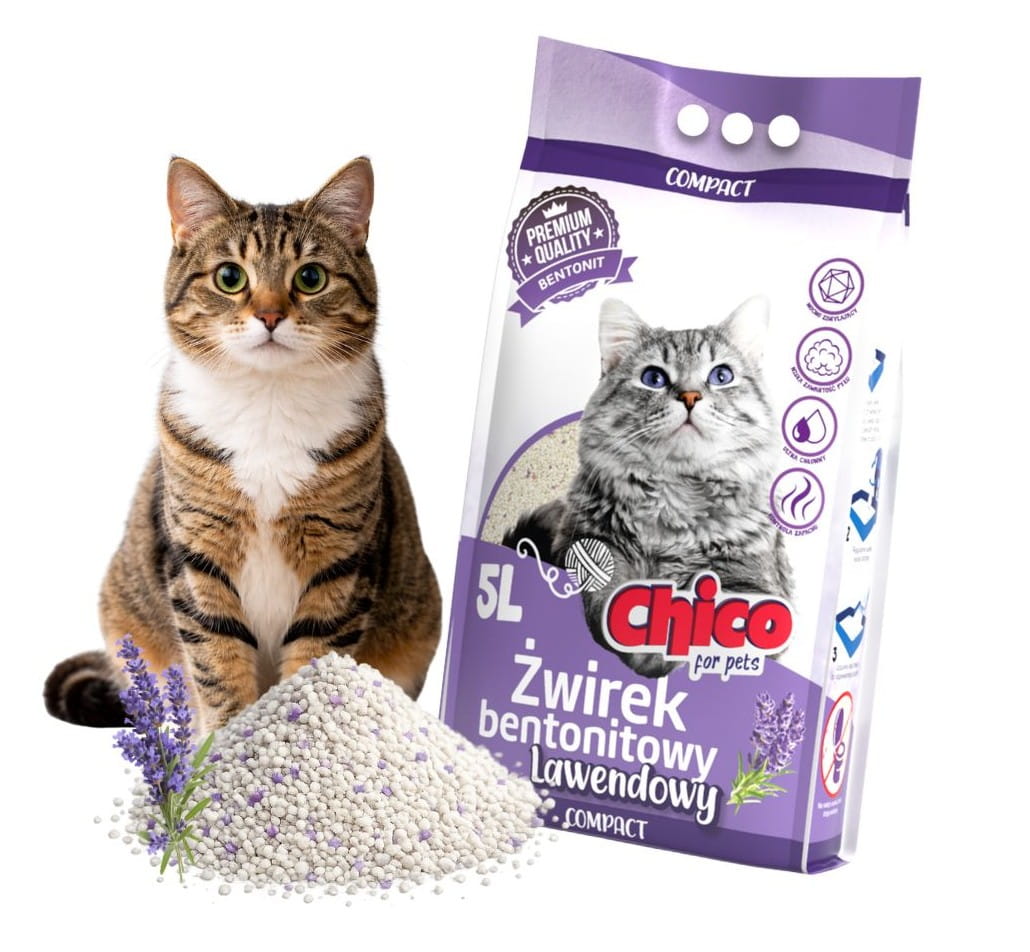 Żwirek bentonitowy dla kota CHICO Compact Lawenda to drobnoziarnisty, biały żwirek premium, który szybko zbryla się po kontakcie z wilgocią i ułatwia codzienne sprzątanie kuwety. Odpylony w 99,5% oraz z delikatnym lawendowym aromatem, skutecznie ogranicza nieprzyjemne zapachy i poprawia komfort w domu. worek 5 l.
