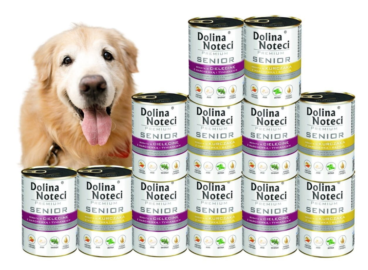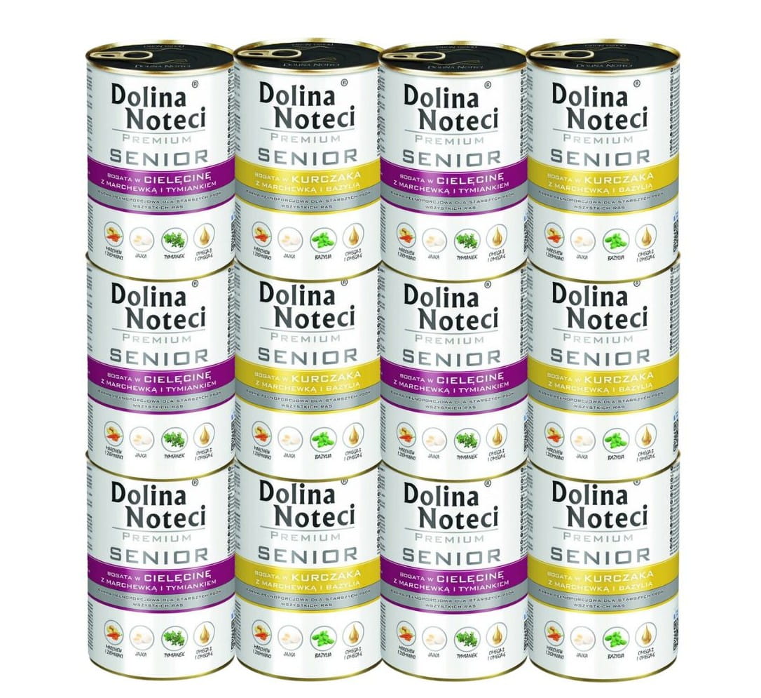 Zestaw karmy mokrej dla psa senior DOLINA NOTECI PREMIUM to mix smaków: cielęcina z marchewką oraz kurczak z marchewką, po 6 puszek każdego wariantu. Receptury są bezzbożowe, bez glutenu, bez barwników, syntetycznych aromatów i polepszaczy smaku, z dodatkiem oleju z łososia oraz drożdży piwnych (MOS, beta-glukany). multipak 12 × 400 g.