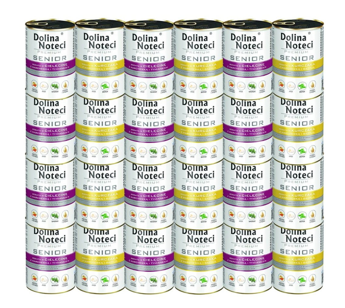 DOLINA NOTECI PREMIUM Senior to zestaw mokrej karmy dla psa seniora bez zbóż – mix 24 × 400 g (12 × cielęcina z marchewką i 12 × kurczak z marchewką). Receptury z olejem z łososia, prebiotycznymi drożdżami (MOS, beta-glukany) i MSM wspierają codzienną kondycję starszego psa. puszka 24x400 g.