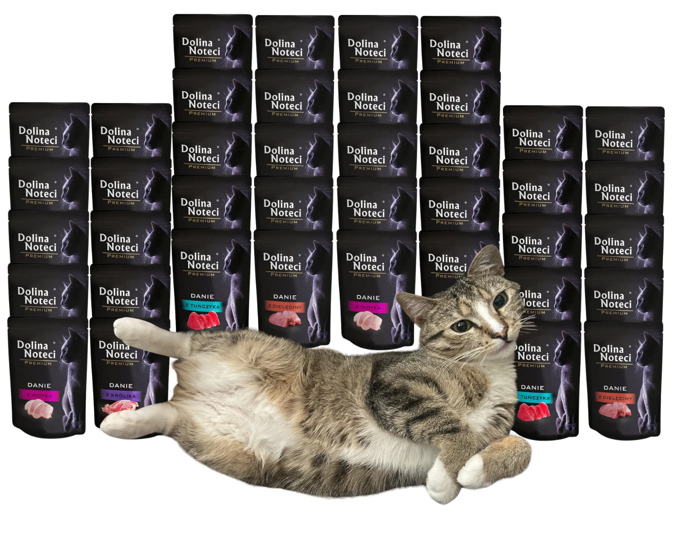 Dolina Noteci Premium MIX 40x85g to pełnoporcjowa, bytowa mokra karma dla dorosłych kotów wszystkich ras, stworzona z myślą o codziennym żywieniu pupila, który zasługuje na smakowite, wartościowe i odpowiednio zbilansowane posiłki. Zestaw zawiera 4 różne warianty smakowe, dzięki czemu codzienna dieta kota może być bardziej urozmaicona, a każdy posiłek dostarcza nie tylko przyjemności jedzenia, ale również ważnych składników odżywczych.