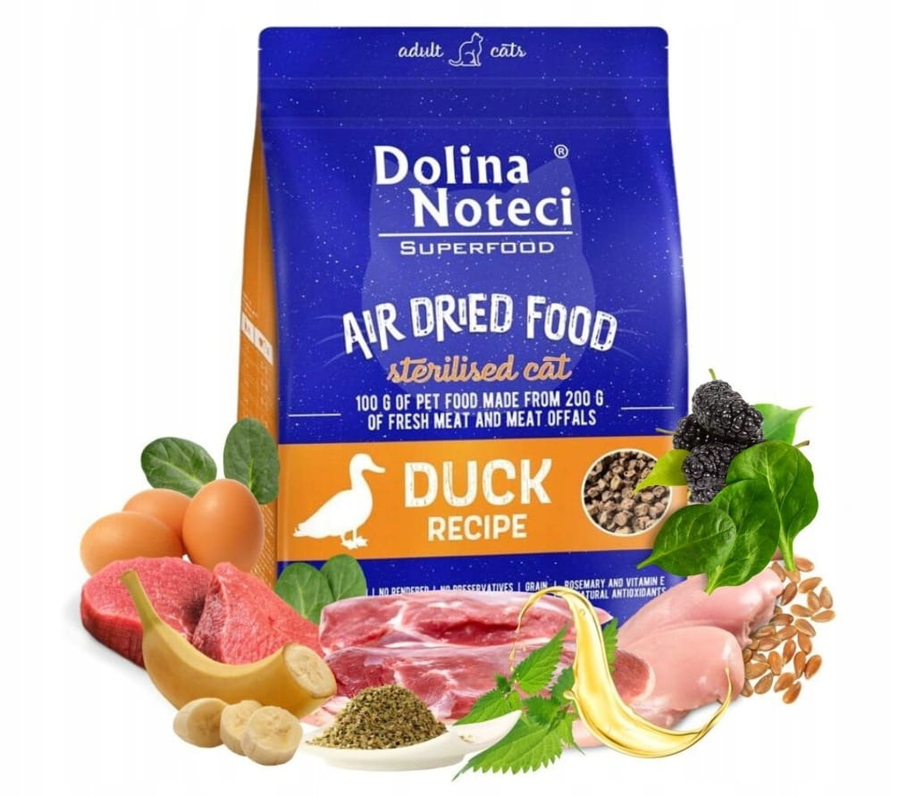 Karma suszona dla kota po sterylizacji Dolina Noteci Superfood danie z kaczki to bytowa, bezglutenowa receptura na bazie kaczki 26% z dodatkiem wołowiny 26%, kurczaka 18% i wieprzowiny 10%. Wyróżnia ją L-karnityna i tauryna oraz składniki wspierające trawienie i uczucie sytości (babka płesznik, inulina, MOS i β-glukany). Opakowanie 1 kg.