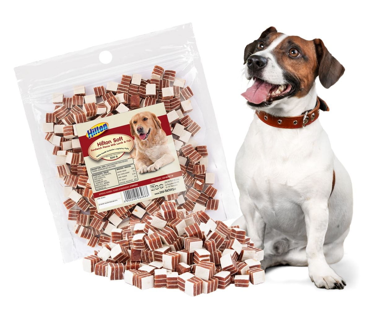 HILTON miękkie kawałki Sandwiche z jagnięciny i ryby dla psa to w 100% naturalny przysmak bez dodatków chemicznych, w formie poręcznych kawałków dla psów wszystkich ras. Miękka konsystencja sprawdza się jako przekąska między posiłkami oraz wygodna nagroda treningowa, a zamykane opakowanie pomaga zachować świeżość i aromat. opakowanie 500 g.