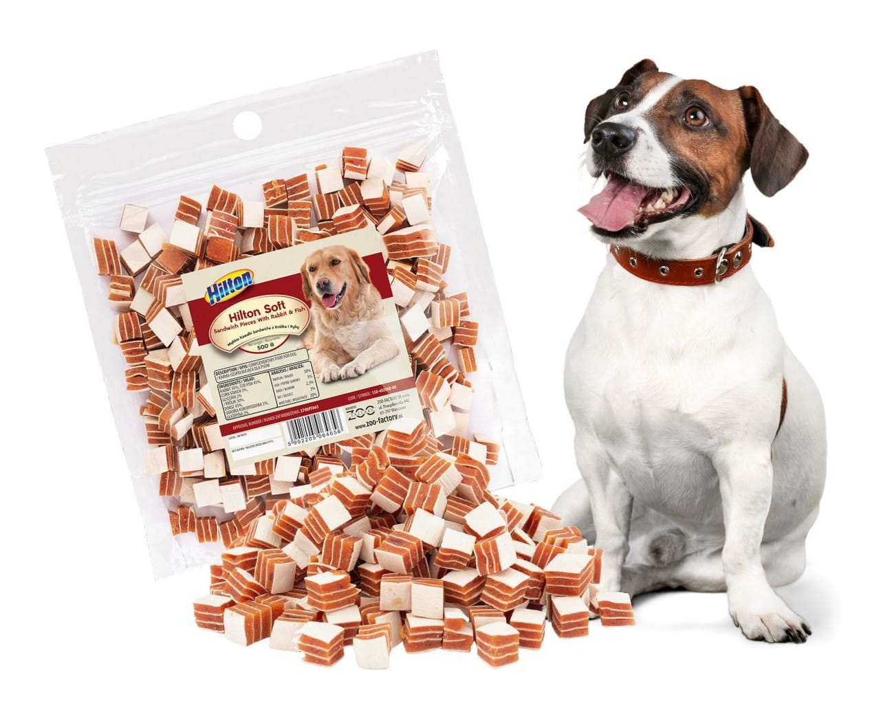 HILTON miękkie kawałki Sandwiche z królika i ryby dla psa to w 100% naturalny przysmak bez dodatków chemicznych, w formie wygodnych kawałków dla psów wszystkich ras. Sprawdza się jako przekąska między posiłkami oraz nagroda treningowa, a zamykane opakowanie pomaga zachować świeżość i aromat. opakowanie 500 g.