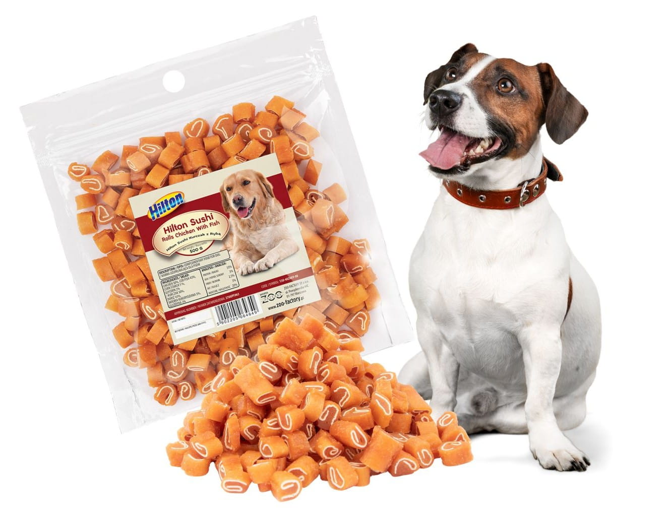 HILTON Sushi Kurczak z rybą dla psa to w 100% naturalny przysmak bez dodatków chemicznych, przeznaczony dla psów wszystkich ras jako przekąska między posiłkami lub nagroda treningowa. Kąski mają wygodny rozmiar do podawania na spacerze i podczas zabawy, a zamykane opakowanie pomaga utrzymać świeżość. opakowanie 500 g.