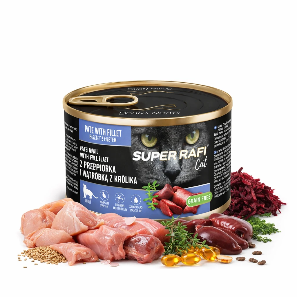 Rafi Super Rafi Cat z przepiórką i wątróbką z królika 185 g to pełnoporcjowa mokra karma dla dorosłych kotów. Sprawdzi się jako codzienny posiłek dla kotów, których opiekunowie szukają bezzbożowej karmy mokrej o wysokiej zawartości składników zwierzęcych, dobrej strawności i atrakcyjnym smaku.