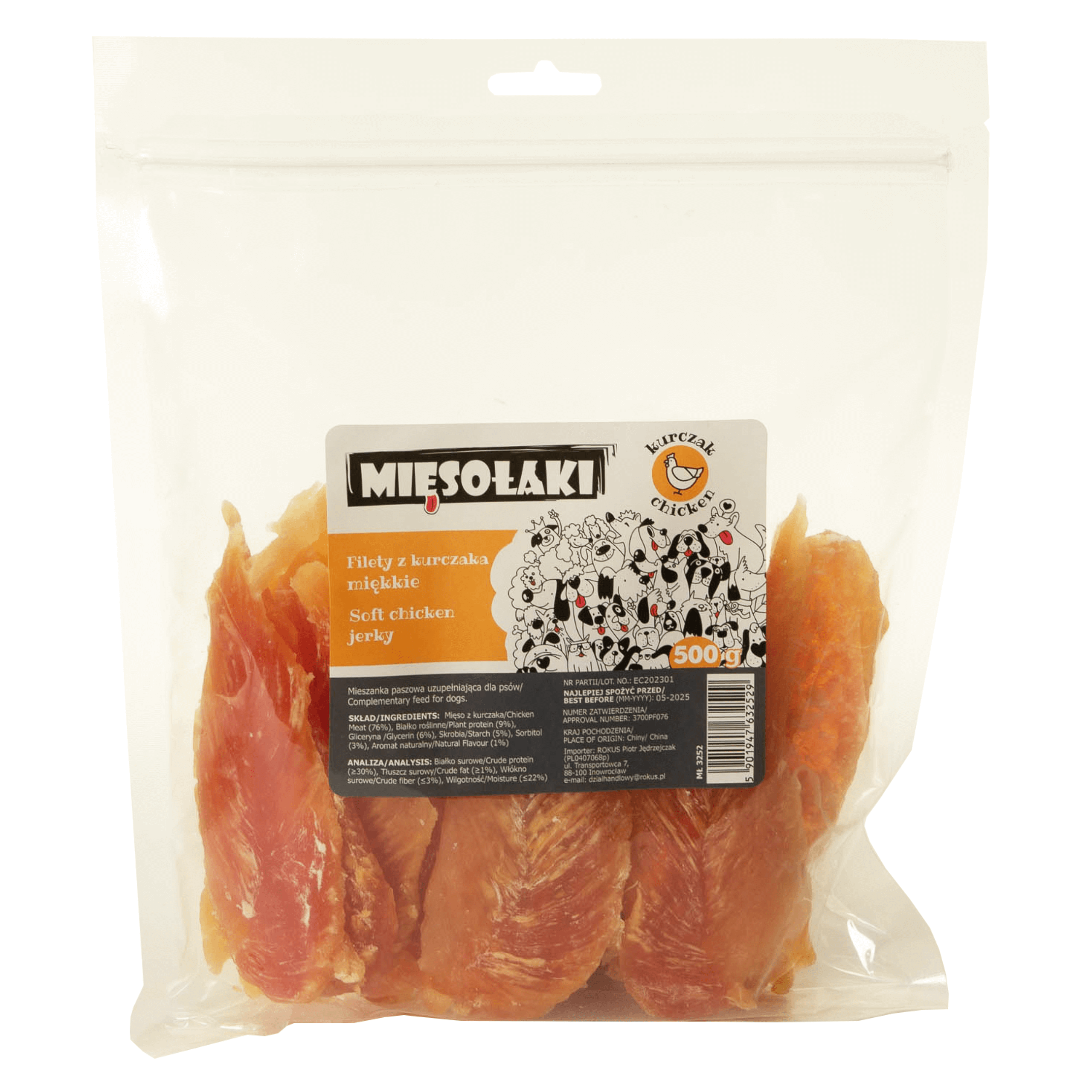 miękkie filety z kurczaka dla psa MięsoŁaki to aromatyczny przysmak dla psów, idealny jako nagroda treningowa lub przekąska między posiłkami. Zawiera 76% mięsa z kurczaka i ma miękką konsystencję, odpowiednią także dla psów starszych i z wrażliwszym uzębieniem. opakowanie 500 g.