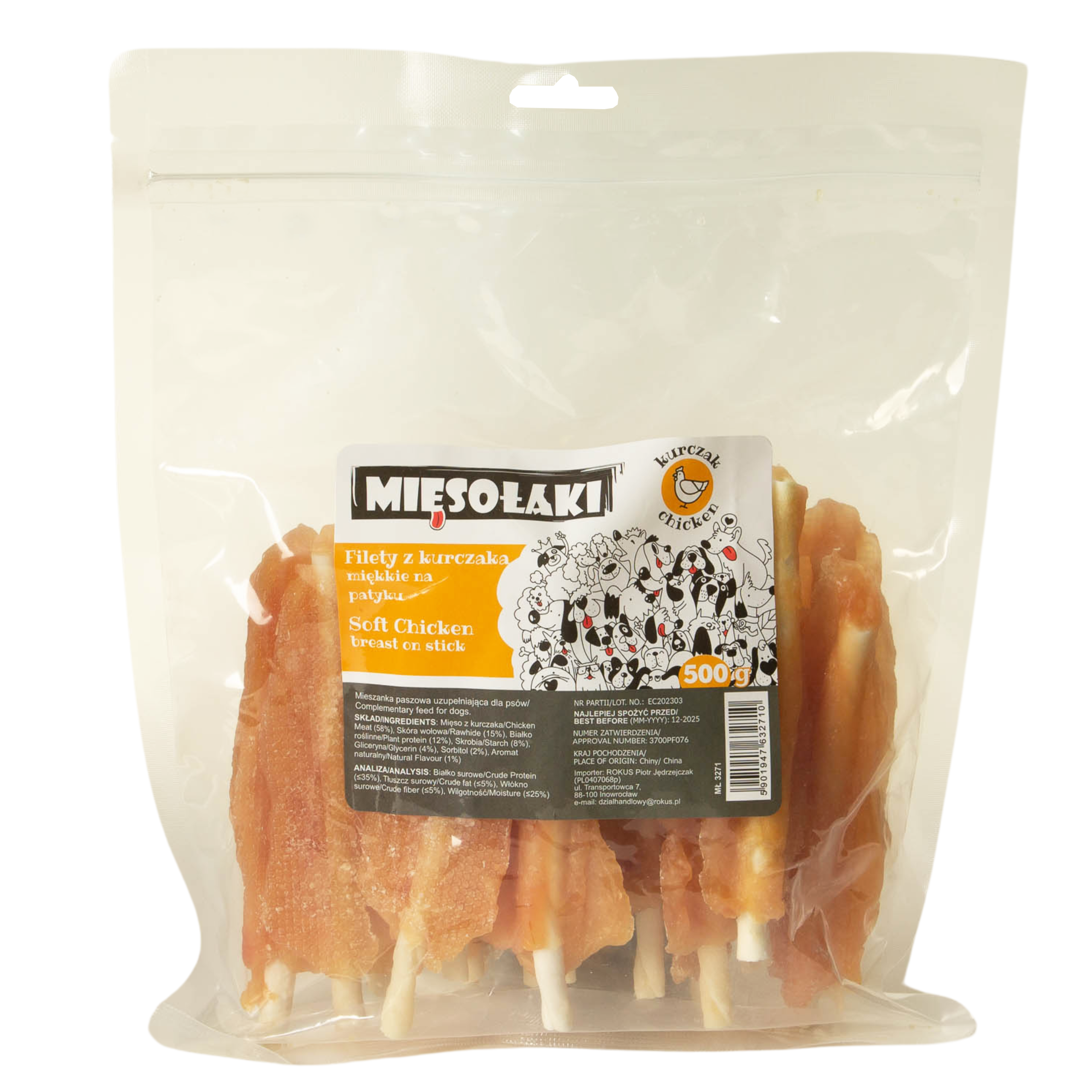 filety z kurczaka na patyku dla psa MięsoŁaki to smakowity przysmak do codziennego nagradzania, łączący 58% mięsa z kurczaka z patyczkiem ze skóry wołowej. Miękka struktura ułatwia gryzienie także psom z wrażliwszym uzębieniem i zachęca do żucia. opakowanie 500 g.