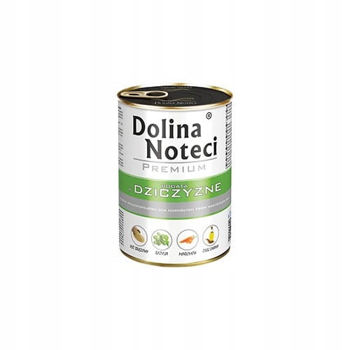 Mokra karma dla psa Dolina Noteci Premium bogata w dziczyznę to pełnoporcjowa propozycja dla psów dorosłych wszystkich ras, odpowiednia także dla psów na diecie bezglutenowej. Wyróżnia ją wysoki udział dziczyzny (25%) oraz brak syntetycznych aromatów, barwników i polepszaczy smaku. Puszka 400 g.