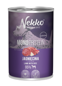 Karma mokra dla szczeniąt NEKKO Monoprotein Junior Jagnięcina z ryżem to pełnoporcjowy posiłek dla szczeniąt i młodych psów wszystkich ras, oparty na jednym źródle białka zwierzęcego. Receptura monobiałkowa z min. 95% jagnięciny, bez glutenu i bez kurczaka, zawiera FOS wspierające układ trawienny w okresie wzrostu. puszka 400 g.