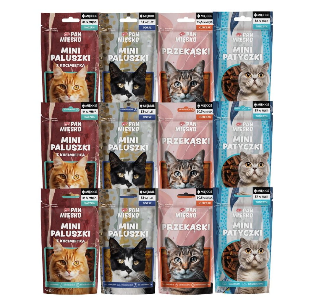 Zestaw przysmaków dla kota Pan Mięsko to mix 4 wariantów miękkich mini paluszków i przekąsek, idealny jako nagroda w zabawie i smaczna przekąska między posiłkami. W multipaku znajdziesz przysmaki o wysokiej zawartości filetów i mięsa (dorsz, kaczka, kurczak, tuńczyk), bez konserwantów. zestaw 12 × 50 g.