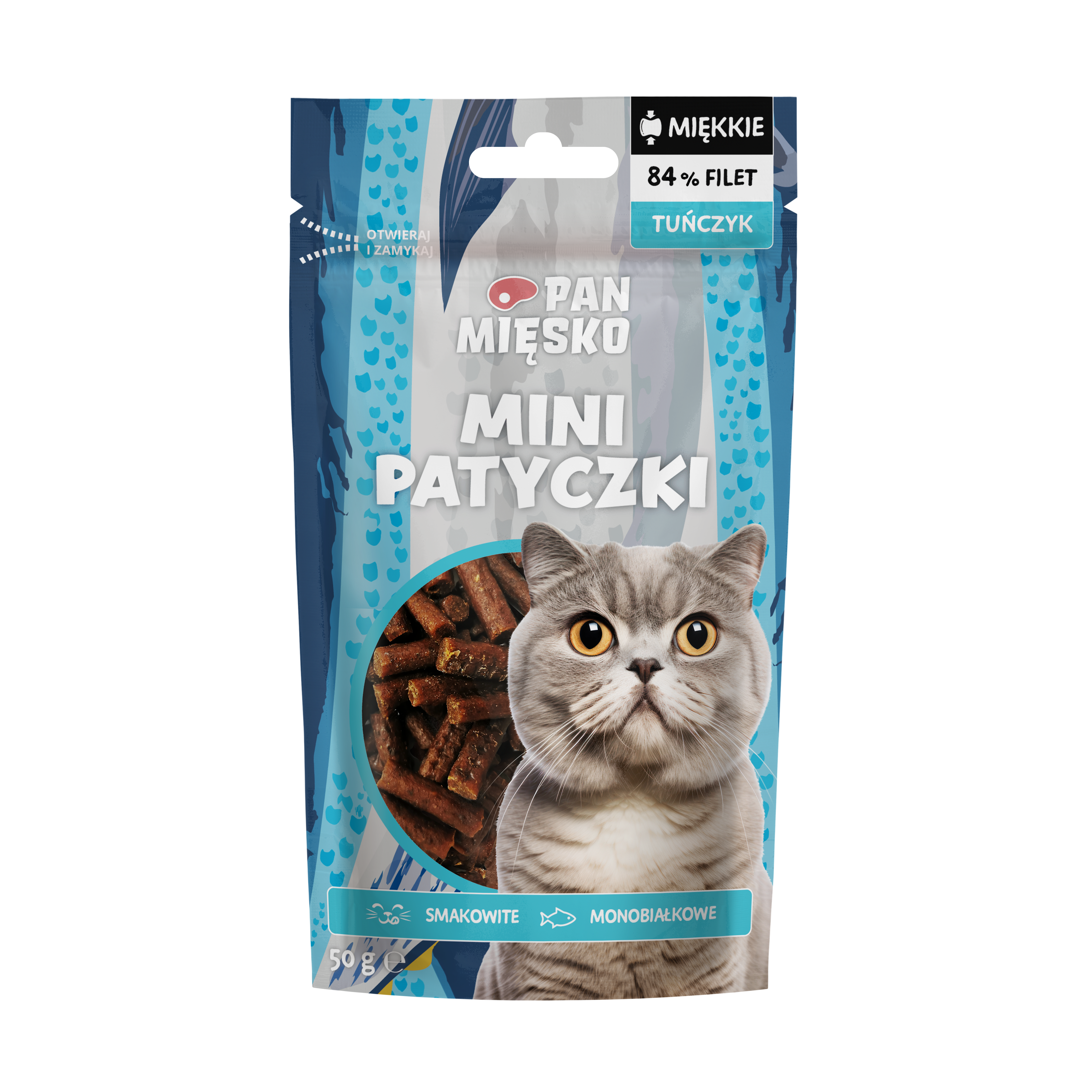 przysmak z tuńczyka dla kota Pan Mięsko Mini Patyczki to karma uzupełniająca dla kotów, stworzona do nagradzania i podawania między posiłkami. Zawiera 84% filetu z tuńczyka, a miękkie patyczki są wygodne do gryzienia nawet dla mniejszych pyszczków. opakowanie 50 g.