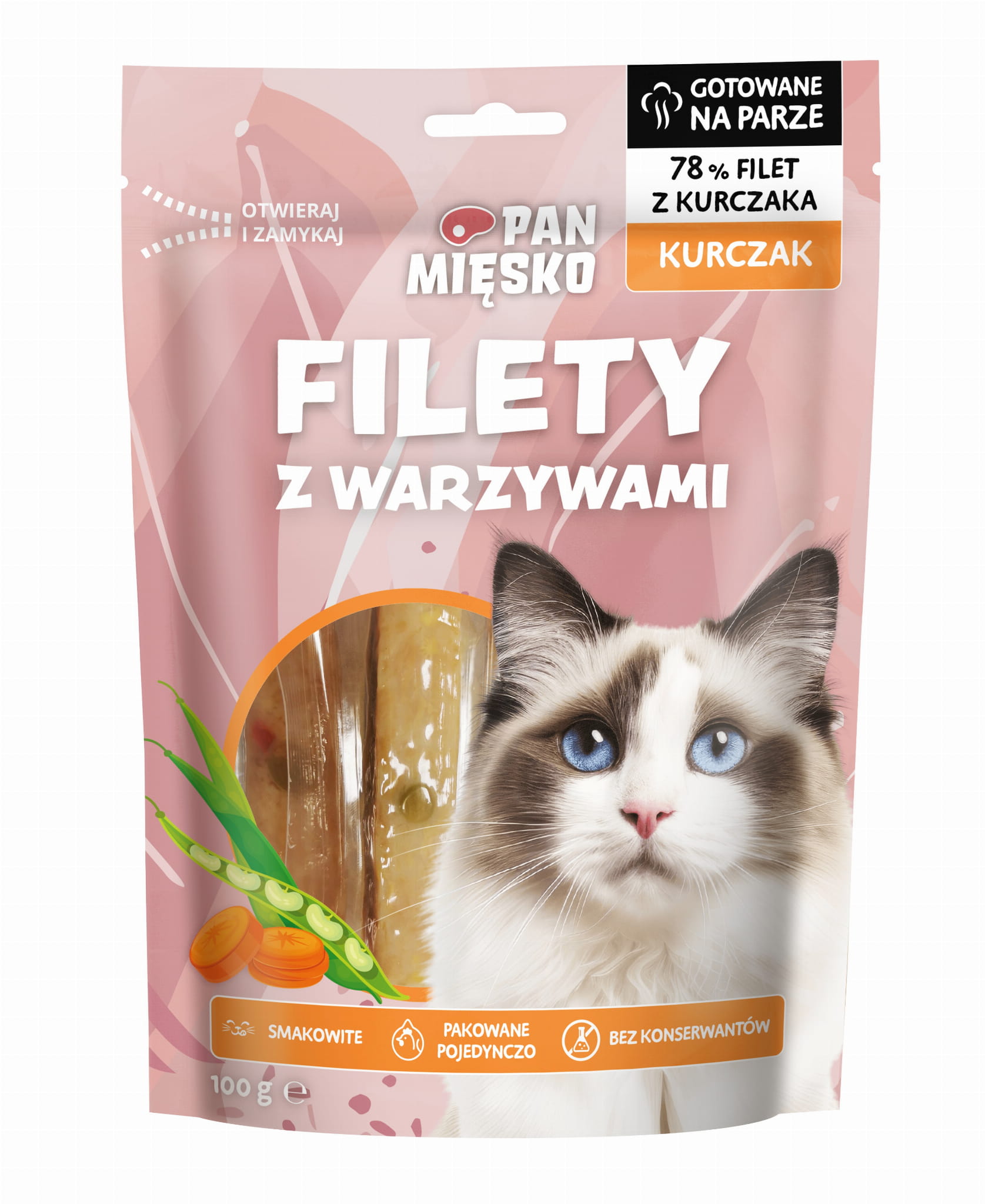 Przysmak dla kota PAN MIĘSKO Filety Kurczak z warzywami to karma uzupełniająca dla kotów powyżej 6. miesiąca życia, oparta na 78% mięsa kurczaka. Wyróżnia się wysoką wilgotnością 70%, co wspiera dodatkowe nawodnienie przy podawaniu jako nagroda lub dodatek do posiłku. opakowanie 100 g.