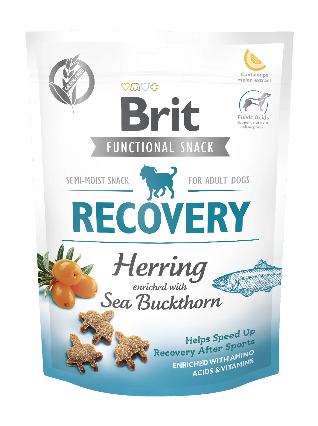 Brit Care Dog Functional Snack Recovery to funkcjonalna karma uzupełniająca dla dorosłych psów, stworzona z myślą o pupilach potrzebujących wsparcia po intensywnym wysiłku fizycznym. To bezzbożowy, półmiękki przysmak dla psa, który łączy doskonały smak z wartościowymi składnikami wspierającymi regenerację organizmu, odbudowę tkanek i codzienną kondycję. Receptura oparta na śledziu i rokitniku została wzbogacona o kolagen, olej z łososia, probiotyki, aminokwasy i witaminy, dzięki czemu świetnie sprawdza się jako smaczne wsparcie po treningu, aktywnym spacerze lub zwiększonym wysiłku.