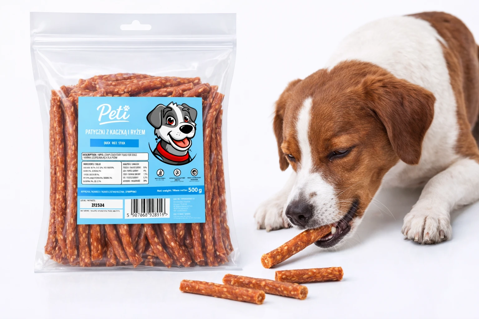Peti Patyczki z Kaczką i Ryżem 500 g – przysmak dla psa, smakołyk treningowy