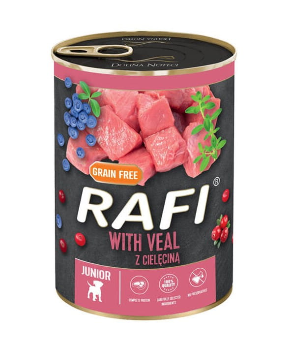 - 12 × 400 g – RAFI mokra karma dla psa JUNIOR z cielęciną