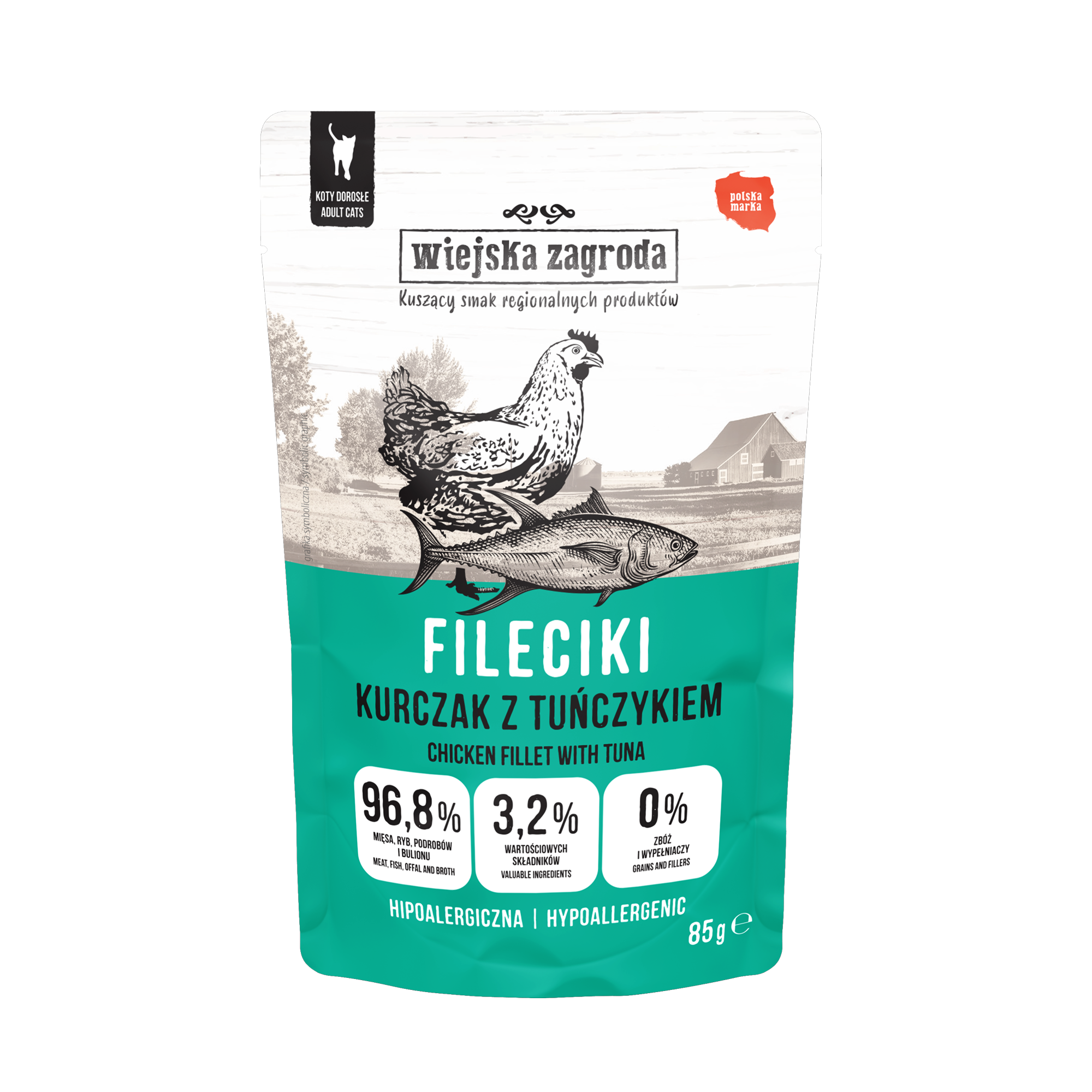 Wiejska Zagroda Fileciki Kurczak z tuńczykiem to pełnoporcjowa karma mokra dla kotów dorosłych, przygotowana w formie soczystych filecików w aromatycznym sosie. Połączenie drobiu i ryby podnosi smakowitość posiłku, a wysoki udział surowców pochodzenia zwierzęcego wspiera żywienie zgodne z potrzebami kota.