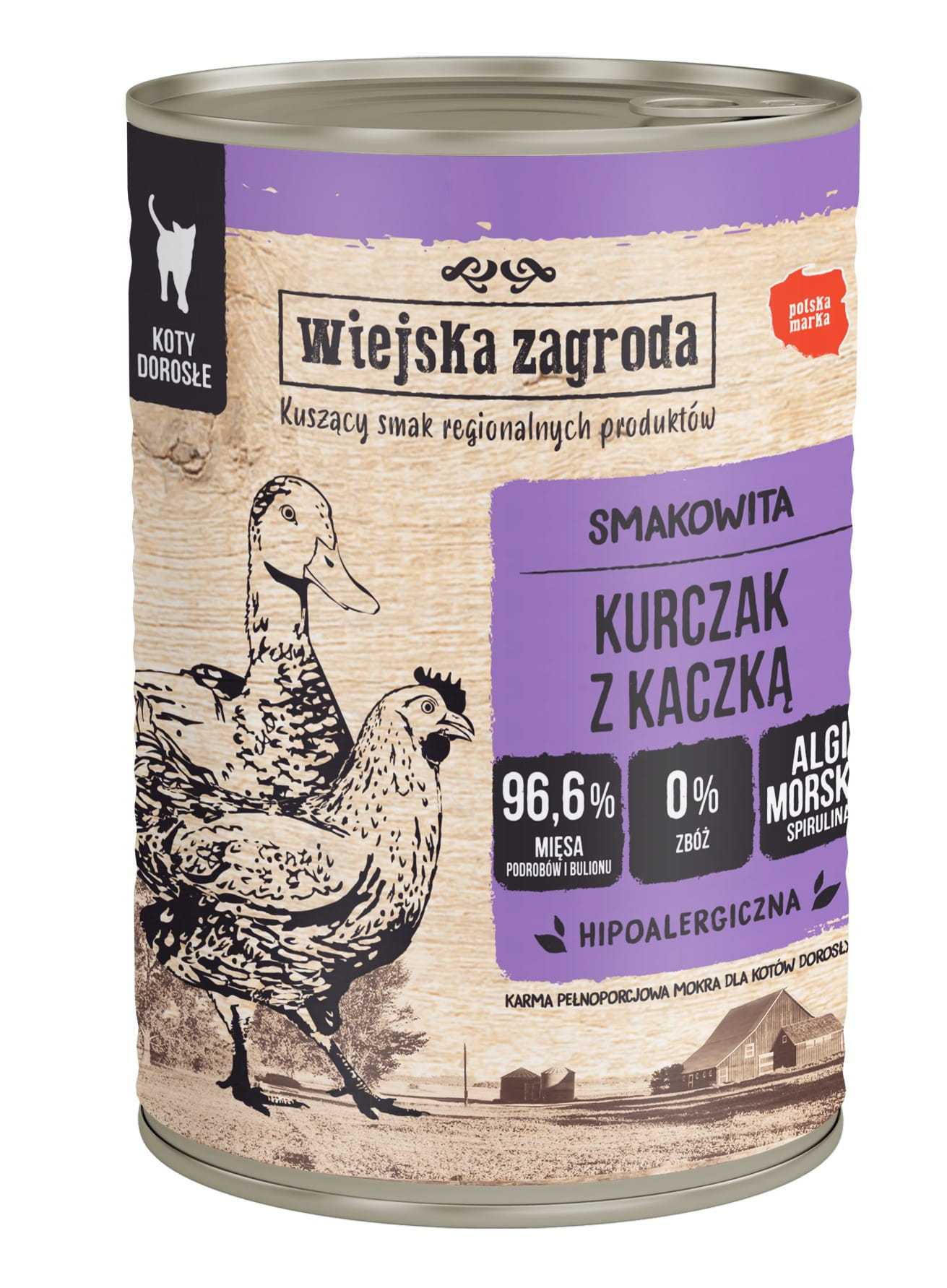 Karma mokra dla kota WIEJSKA ZAGRODA Kurczak z kaczką to pełnoporcjowy posiłek dla kotów dorosłych, oparty na kurczaku z podrobami oraz kaczce (szyjki). Receptura wyróżnia się brakiem zbóż i dodatkiem tauryny, wspierając codzienne żywienie mięsożercy. puszka 400 g.