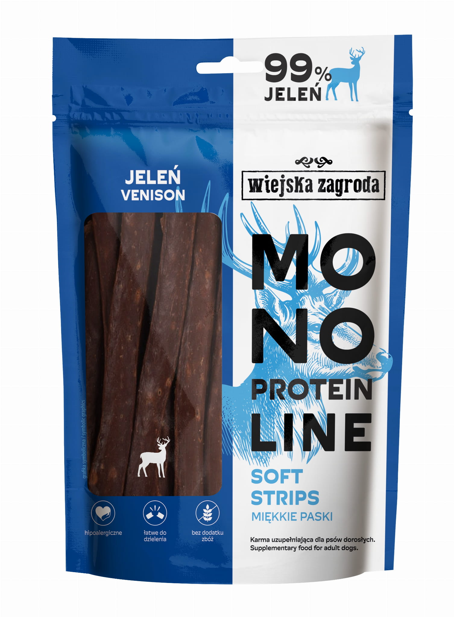 Monoproteinowe miękkie paski dla psa z jelenia WIEJSKA ZAGRODA to przysmak dla psów o wrażliwym przewodzie pokarmowym i skłonności do alergii. Receptura oparta na jednym źródle białka, bez zbóż i roślin strączkowych, zawiera 99% składników zwierzęcych. opakowanie 100 g.