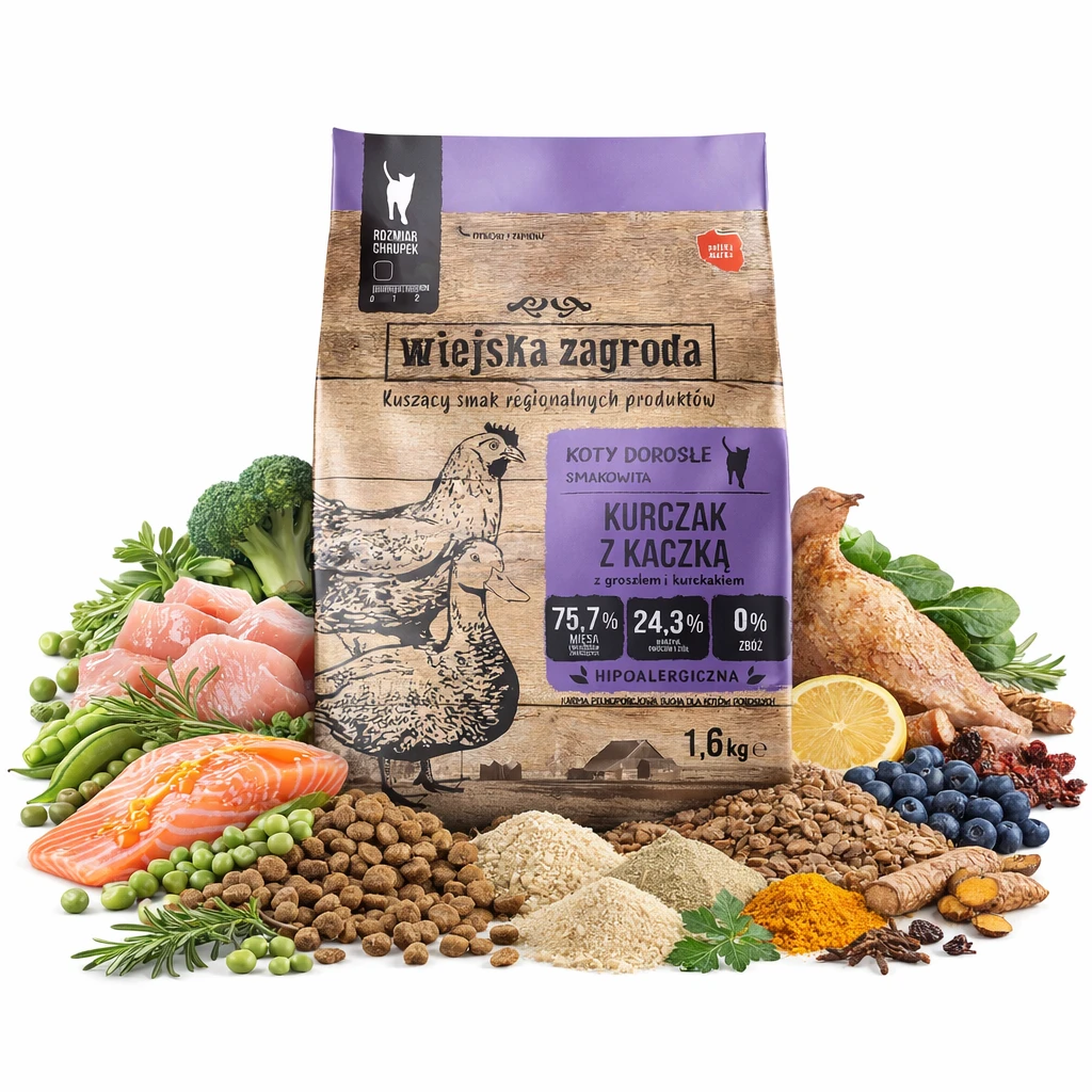Wiejska Zagroda Kurczak z kaczką 1,6kg będzie odpowiednia dla opiekunów, którzy chcą podawać swojemu kotu suchą karmę bezzbożową o wysokiej zawartości mięsa i prostym, przejrzystym składzie. To bardzo dobry wybór dla kotów dorosłych, również tych bardziej wybrednych, które oczekują od posiłku intensywnego aromatu i wysokiej smakowitości.